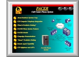 Database Systems Corp. has prepared a full length presentation of our PACER phone system with IVR features that you can easily download and view. Included in this presentation are several different Auto Attendant presentations and PACER campaign demonstrations along with an explanation of our IVR capability with online reports. This presentation includes PACER's robust features plus a tutorial on predictive dialing. Also included is a presentation on remote agents and web integration. Simply click on the image to your right to start the download process of our PACER demonstration.